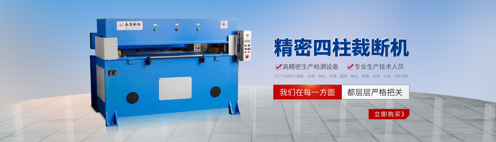 公司專業(yè)制造l 2T一25T液壓搖臂式裁斷機:25T一30T液壓平面式裁斷機;25T一30T液壓四柱龍門移動式裁斷機;25T一100T液壓四柱平面式裁斷機:30T一100T精密四柱式裁斷機(自動進料);100T一200T液壓四柱下壓式裁斷機(自動進料)和客戶要求的特型裁斷機械系列。產(chǎn)品規(guī)格齊全,可廣泛適用于制鞋、皮具、箱包、玩具、服裝、帽業(yè)、吸塑、包裝、木業(yè)、汽車裝飾等行業(yè)。